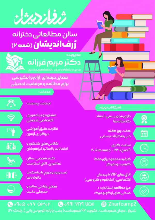 سالن مطالعاتی دخترانه ژرفاندیشان (شعبه ۲) واقع در میدان قصردشت، کوچه ۲ میرزای شیرازی شیراز مکانی برای رشد، تمرکز و شکوفایی علمی، اتاقهای VIP، ساعات کاری منظم، دارای مجوز رسمی از نهاد کتابخانههای کشور در خدمت شما عزیزان میباشد.